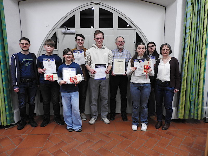V. l. n. r.: Julian Weber (Dirigent ffortissimo), Yannis Dürer (D1 Schlagzeug), Ersa Berisha (D1 Querflöte), Paul Schuhmann (D2 Bariton), Linus Neugebauer (Verbandssieger
