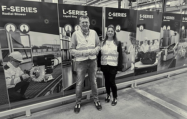 Dr. Jörg Geier (Kreisentwicklung Landkreis Rhön-Grabfeld) und Manuela Michel (Wirtschaftsförderung Landkreis Rhön-Grabfeld) beim Unternehmensbesuch bei Ingersoll Rand in Bad Neustadt vor Abbildungen von in Deutschland gefertigten Industrieprodukten des Unternehmens.