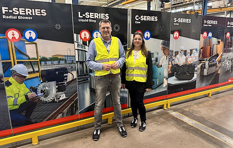 | Dr. Jörg Geier (Kreisentwicklung Landkreis Rhön-Grabfeld) und Manuela Michel (Wirtschaftsförderung Landkreis Rhön-Grabfeld) beim Unternehmensbesuch bei Ingersoll Rand in Bad Neustadt vor Abbildungen von in Deutschland gefertigten Industrieprodukten des Unternehmens. |