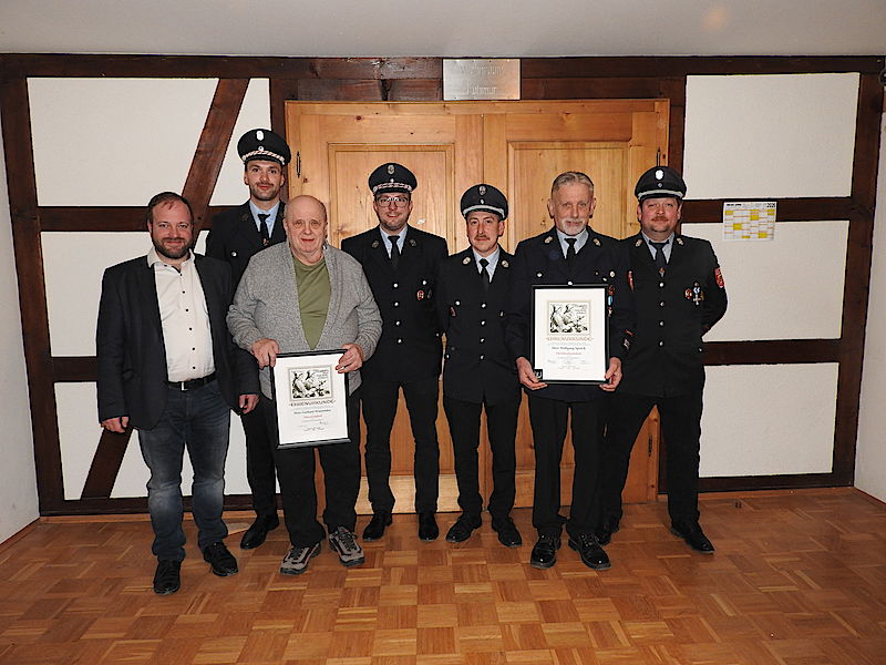 Von links: Bürgermeister Steffen Malzer, 2. Vorstand Sebastian Hock, Ehrenmitglied Gerhard Wienröder, 1. Vorstand Sebastian Heuring, 1. Kommandant Thomas Hohmann, Ehrenkommandant Wolfgang Sporck, 2. Kommandant Michael Seifert.