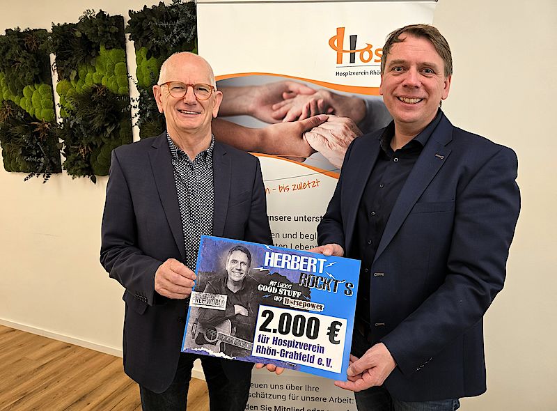 | Große Freude bei Richard Knaier (li). 1. Vorsitzender des Hospizvereins Rhön-Grabfeld über eine Spende in Höhe von 2.000 Euro von Christof Herbert, 1. Vorsitzender des CSU Kreisverbandes Rhön-Grabfeld. Die stolze Summe kam durch eine Spendensammlung beim Konzert „Herbert rockt’s“ am 6. März in Bad Neustadt zusammen. |